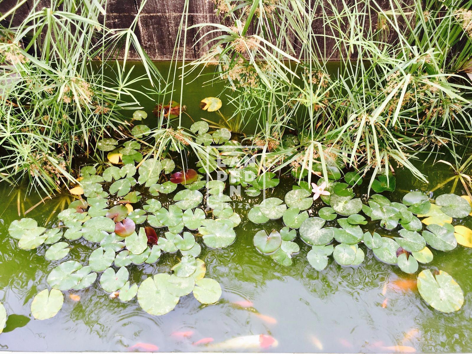 The private garden — landscaped with native vegetation — features a chill-out zone, dining area, and zen pond with fish and aquatic plants, perfect for relaxing under the southwest sun that bathes the home all day, all year round.