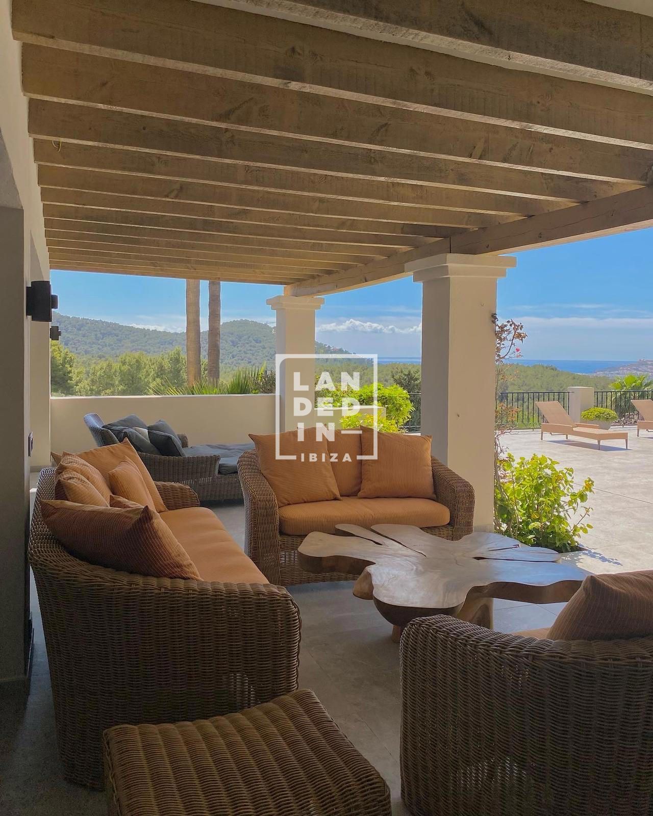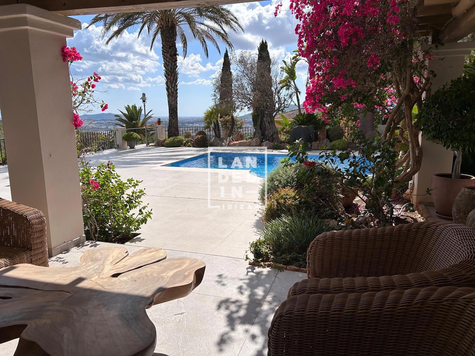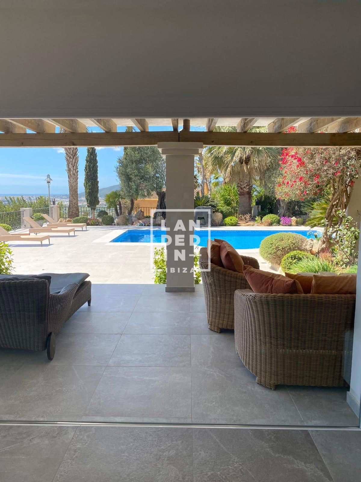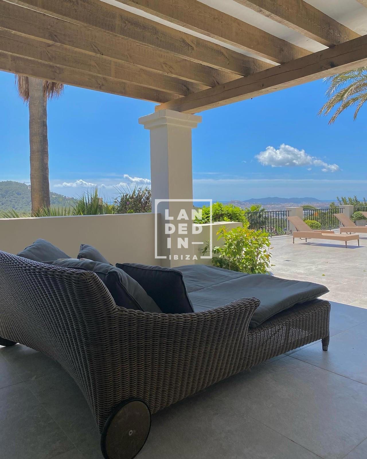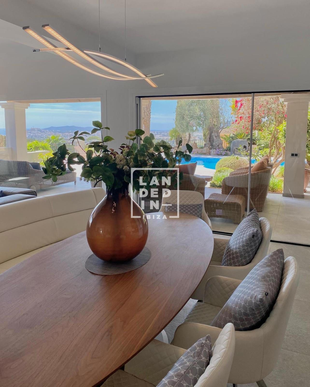 El exterior es un auténtico paraíso, con una piscina privada rodeada de impresionantes vistas, perfecta para relajarse y disfrutar del clima mediterráneo. Desde la villa, se puede admirar una panorámica inigualable del mar, Formentera y la vibrante ciudad de Ibiza.