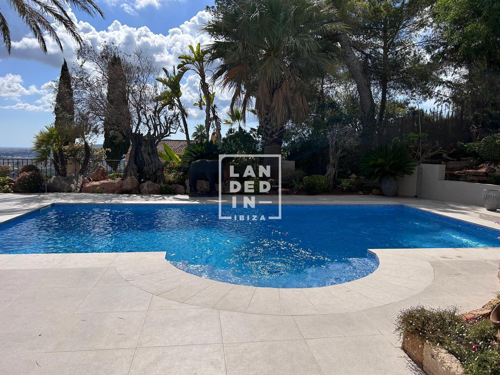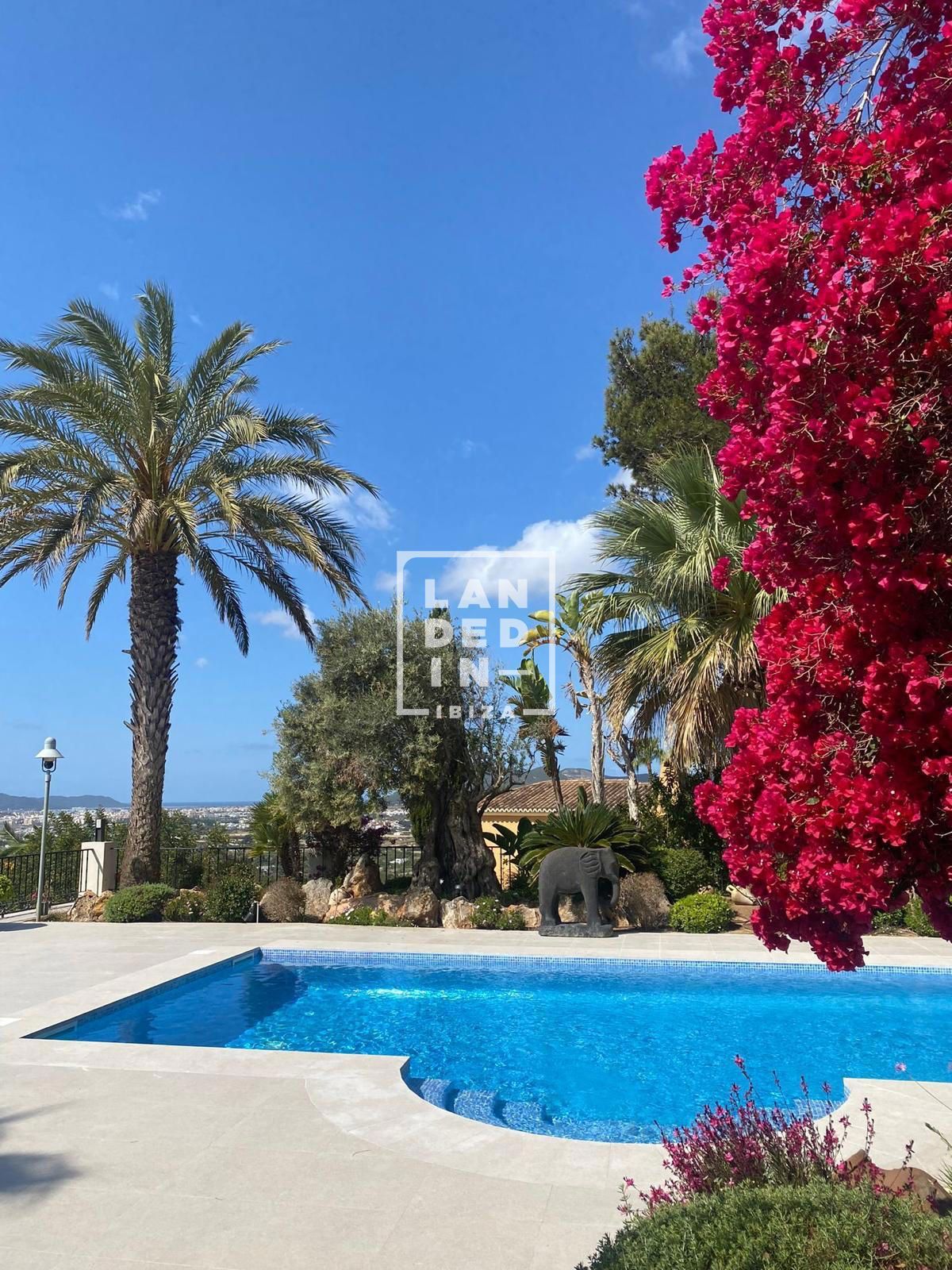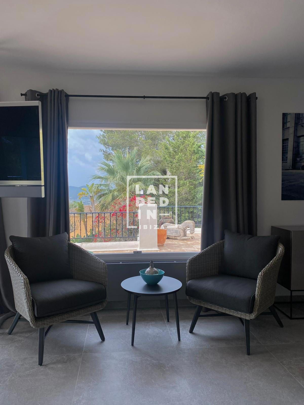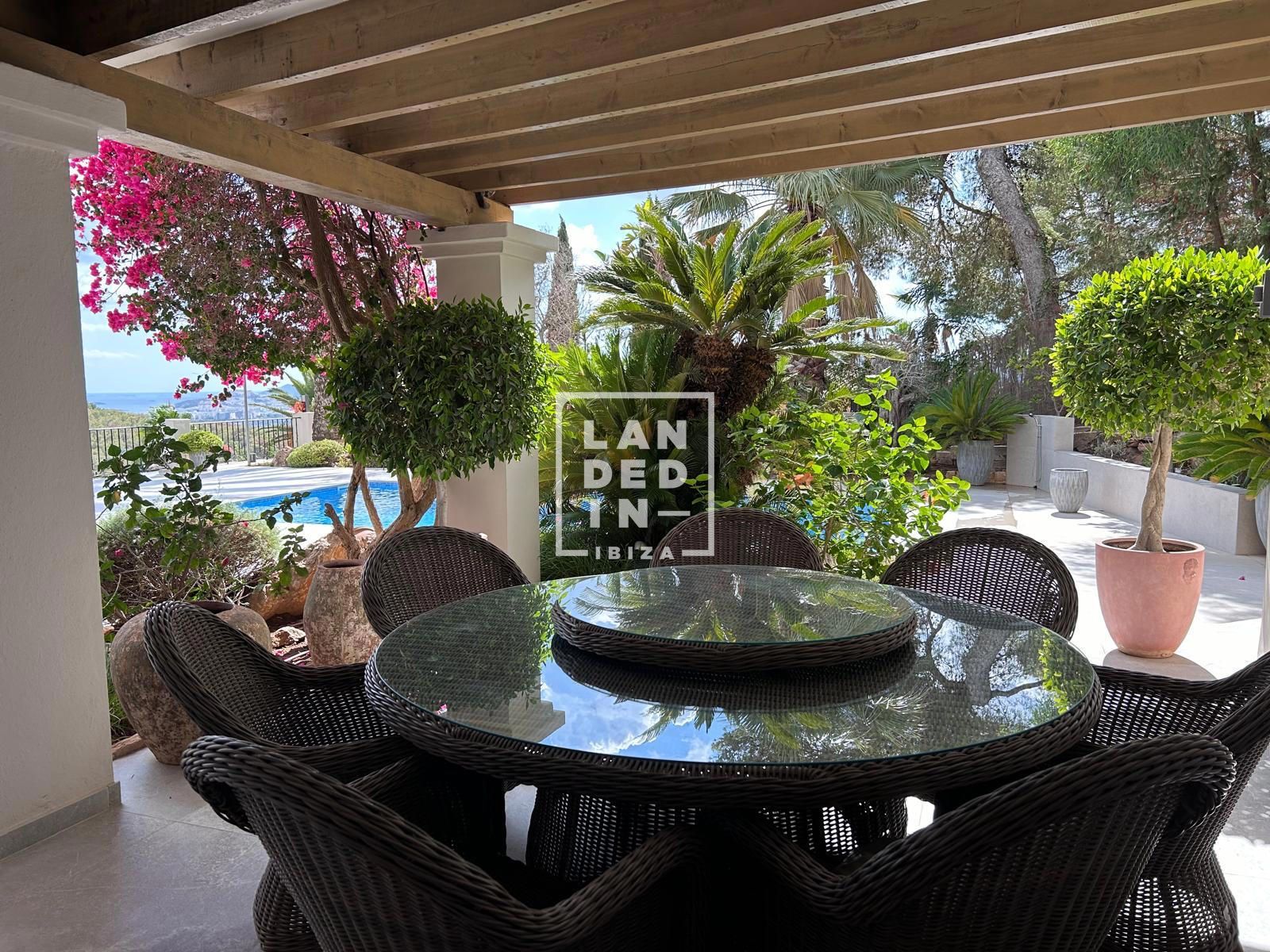 El exterior es un auténtico paraíso, con una piscina privada rodeada de impresionantes vistas, perfecta para relajarse y disfrutar del clima mediterráneo. Desde la villa, se puede admirar una panorámica inigualable del mar, Formentera y la vibrante ciudad de Ibiza.